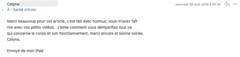 Merci beaucoup pour cet email, c’est fait avec humour, vous m’avez faitrire avec vos petits vidéos. J’aime comment vous démystifiez tout cequi concerne le corps et son fonctionnement... Célyne