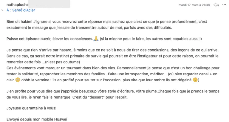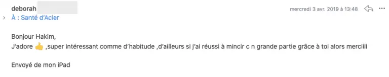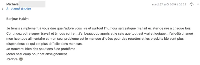 Vos mails sont toujours aussi intéressants. Je prends toujours autant de plaisir à les lire. Ma nouvelle hygiène alimentaire est une renaissance et je vous remercie pour tout ce que vous m’apporter à travers vos mails... Karoline