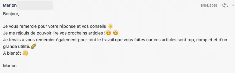 Je me réjouis de pouvoir lire vos prochains emails. Je tenais à vous remercier pour tout le travail que vous faites car ces emails sont top, complet et d’une grande utilisé... Marion