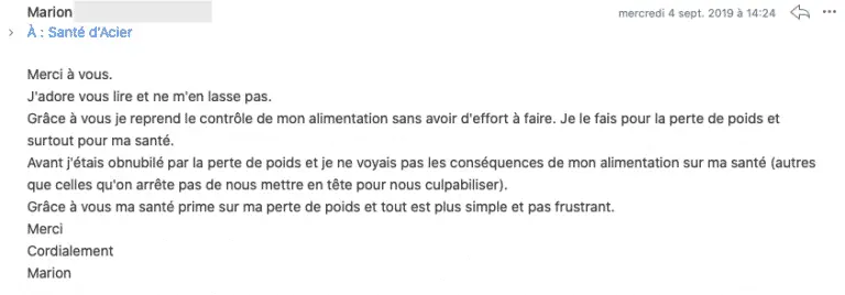 J’adore vous lire et ne m’en lasse pas. Grâce à vous je reprend le contrôle de mon alimentation sans avoir d’effort à faire... Marion
