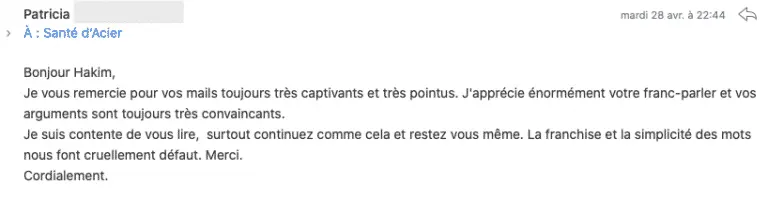 Je vous remercie pour vos mails toujours très captivants et très pointus. J’apprécie énormément votre franc-parler et vos arguments sont toujours très convaincants... Patricia