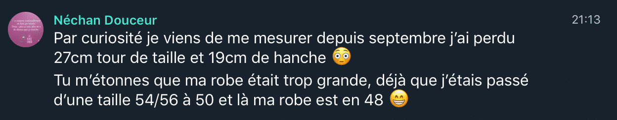 Je ne peux peut être pas vous dire combien de poids vous allez perdre, mais par contre ce que je peux vous garantir, c’est que vous allez perdre du poids, que ce soit 1, 3, 5, 10, 20 kilos, je ne sais pas, et ce n’est pas le plus important aujourd’hui, ce qui importe c’est que vous vous repreniez en main, que vous soyez bien dans votre corps, et que vous évoluez peu à peu vers votre objectif à long terme, et peu importe le temps que ça prendra.